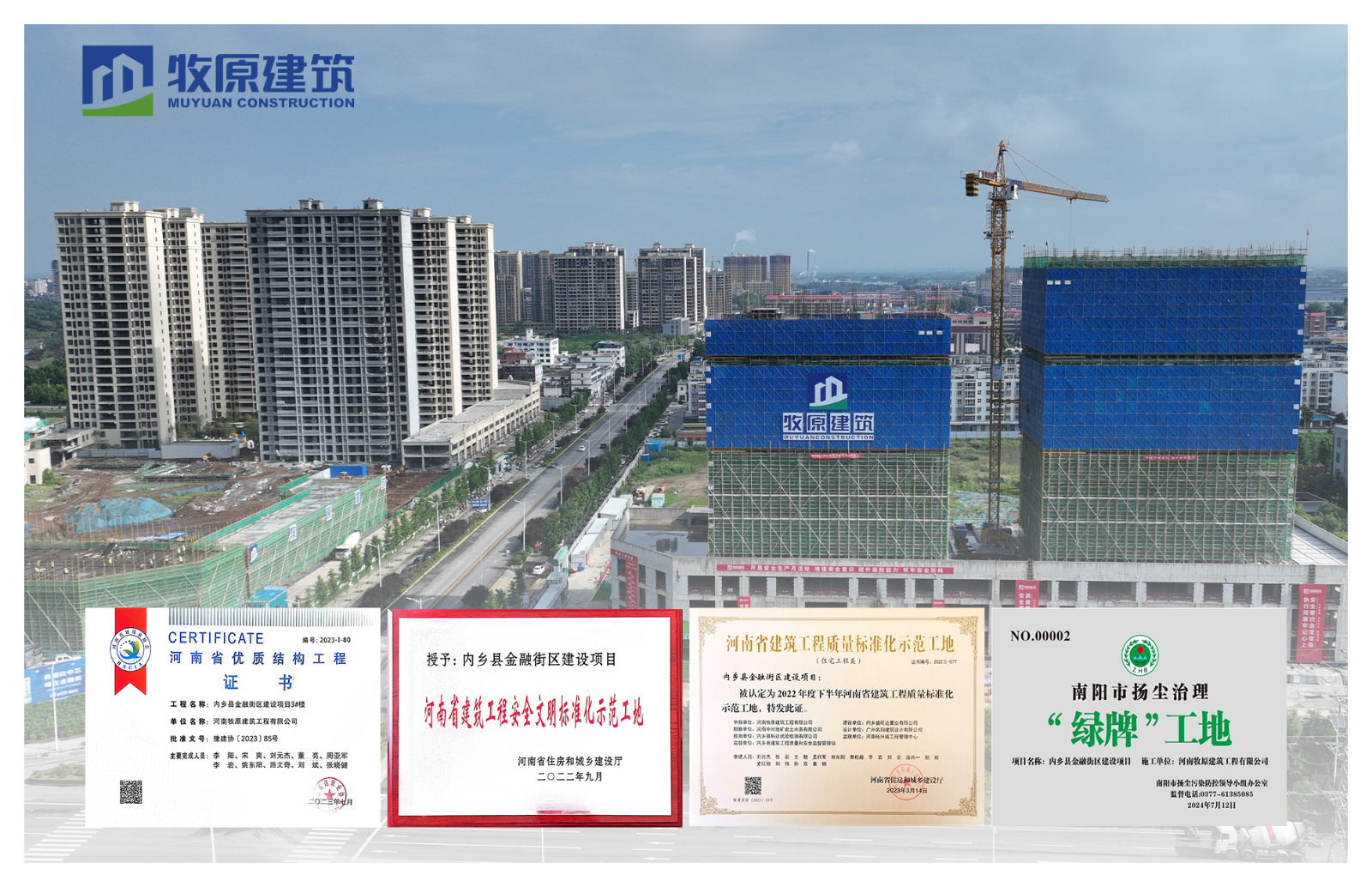 上下一心齊攻堅(jiān),同心奮戰(zhàn)保交期。在整個(gè)施工過程中,金融街項(xiàng)目部以交付節(jié)點(diǎn)為期限,倒排工期,細(xì)化建設(shè)任務(wù),從安全、生產(chǎn)等各條線組建攻堅(jiān)隊(duì),將人、材、機(jī)資源配備精確到每一天、每一個(gè)工作面,滿足每個(gè)供貨節(jié)點(diǎn),確保項(xiàng)目安全、質(zhì)量、工期協(xié)同進(jìn)行。為確保完美交付標(biāo)準(zhǔn),項(xiàng)目部嚴(yán)抓工程質(zhì)量、嚴(yán)控原材料進(jìn)場(chǎng)品質(zhì)、嚴(yán)格執(zhí)行施工工序技術(shù)交底,堅(jiān)決執(zhí)行好各項(xiàng)工藝驗(yàn)收標(biāo)準(zhǔn),贏得了業(yè)主和行業(yè)的一致認(rèn)可。在金融街項(xiàng)目建設(shè)過程中,牧原建筑先后獲得河南省優(yōu)質(zhì)結(jié)構(gòu)工程、河南省建筑工程質(zhì)量標(biāo)準(zhǔn)化示范工地、河南省建筑工程安全文明標(biāo)準(zhǔn)化示范工地、南陽市揚(yáng)塵治理“綠牌”工地等榮譽(yù)資質(zhì)。