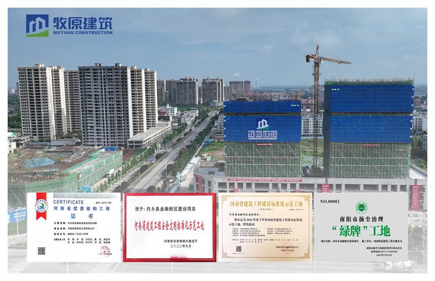 在金融街項(xiàng)目建設(shè)中,牧原建筑始終嚴(yán)控工程質(zhì)量,強(qiáng)化安全意識(shí),獲得了各級(jí)主管部門和行業(yè)、業(yè)主的認(rèn)可與信賴,其中一期項(xiàng)目已交付業(yè)主使用。(一期、二期)工程先后榮獲了河南省優(yōu)質(zhì)結(jié)構(gòu)工程、南陽市優(yōu)質(zhì)結(jié)構(gòu)工程、河南省建筑工程質(zhì)量標(biāo)準(zhǔn)化示范工地、河南省建筑工程安全文明標(biāo)準(zhǔn)化示范工地、南陽市揚(yáng)塵治理“綠牌”工地等資質(zhì)榮譽(yù)。